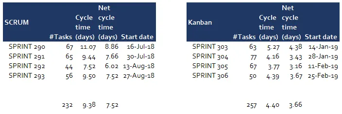 He recopilado algunos números (gracias a nuestro issue tracker) de los últimos sprints con Scrum y de los más recientes con Kanban para comparar: