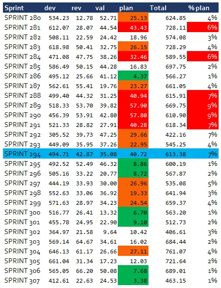 En caso de que quieras saber qué significan las otras columnas: “dev” significa tiempo de desarrollo, “rev” tiempo de code reviews, y “val” tiempo de validaciones.