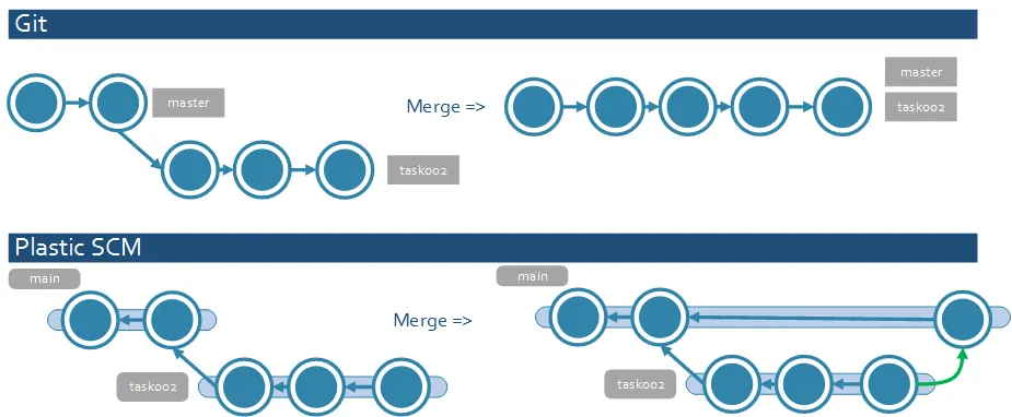 ¿Es muy importante esto? Implica trazabilidad total y facilidad de uso. No conozco a un solo instructor de Git que no te diga que tiene que amueblar la cabeza de los alumnos para que piensen en punteros y no en ramas “normales”. En Plastic es más intuitivo, sin más.