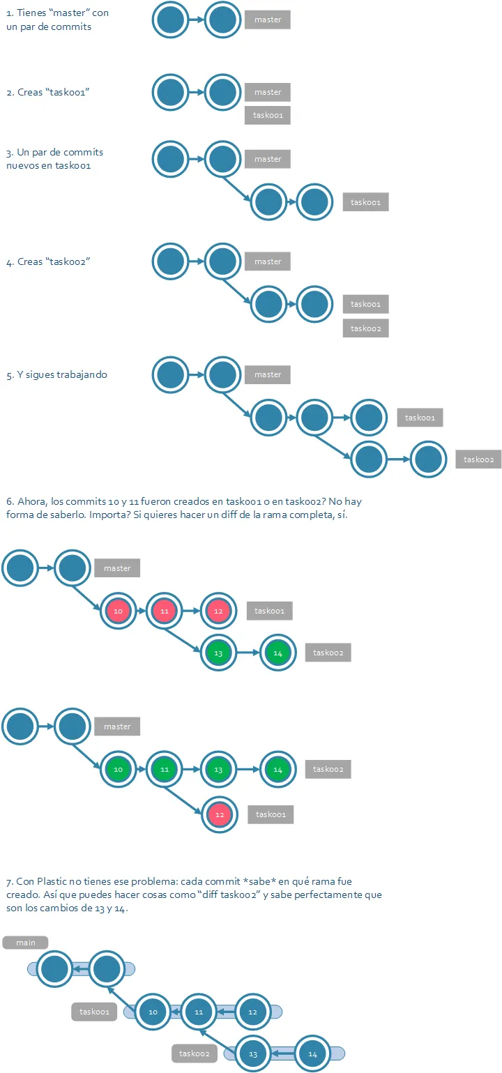 Una cosa más: como te decía, en Git puedes dejar de saber fácilmente qué pertenecía a qué rama, mientras que en Plastic no: